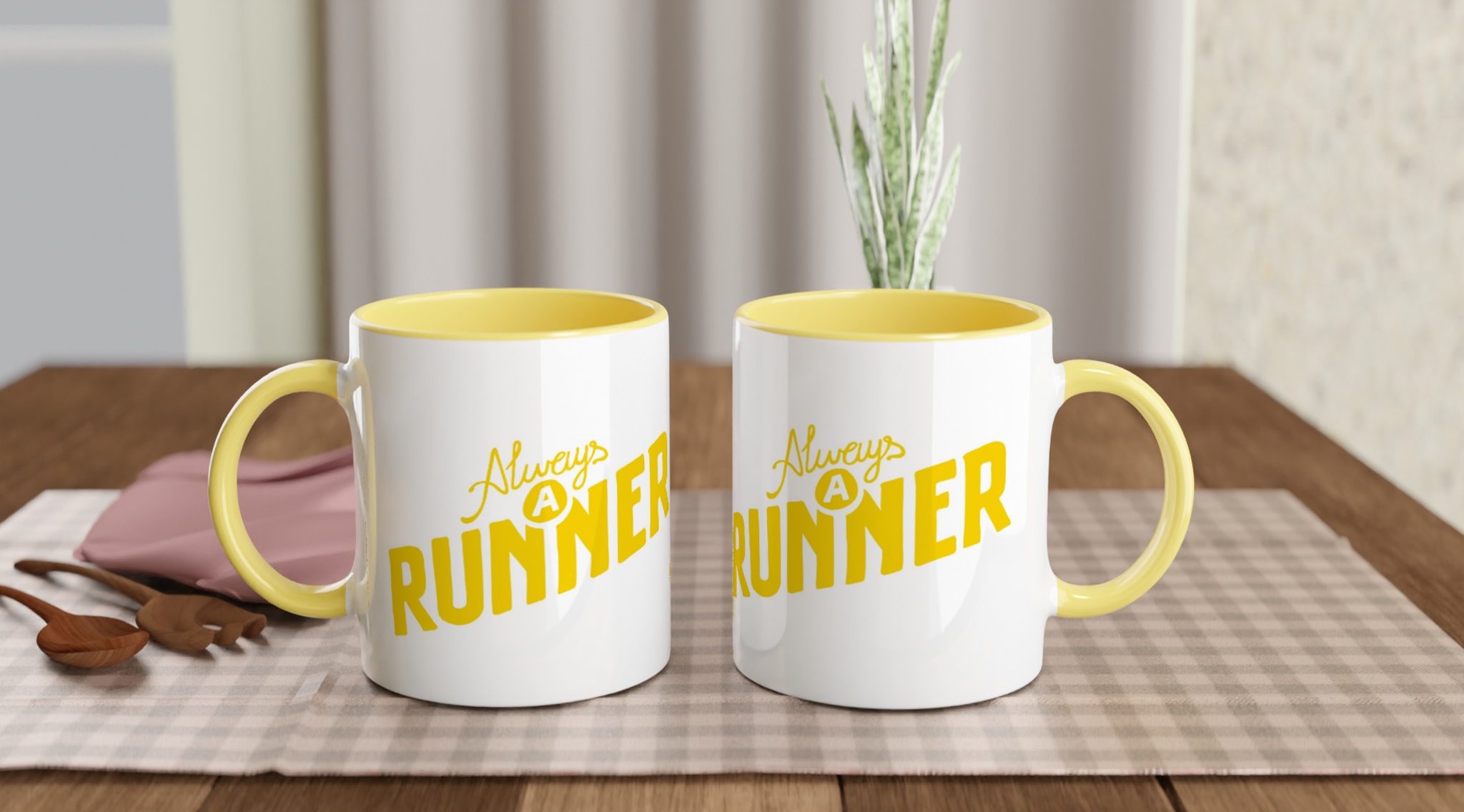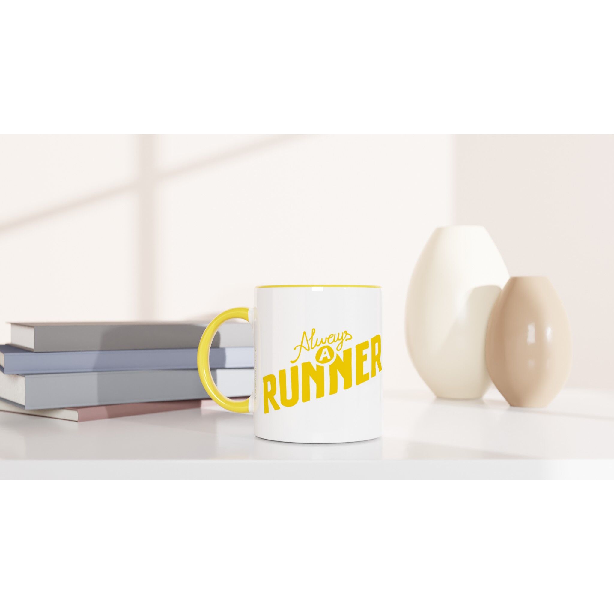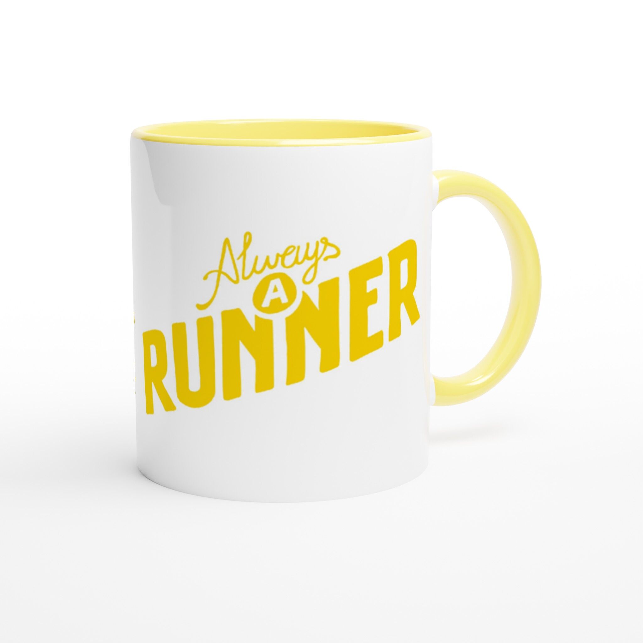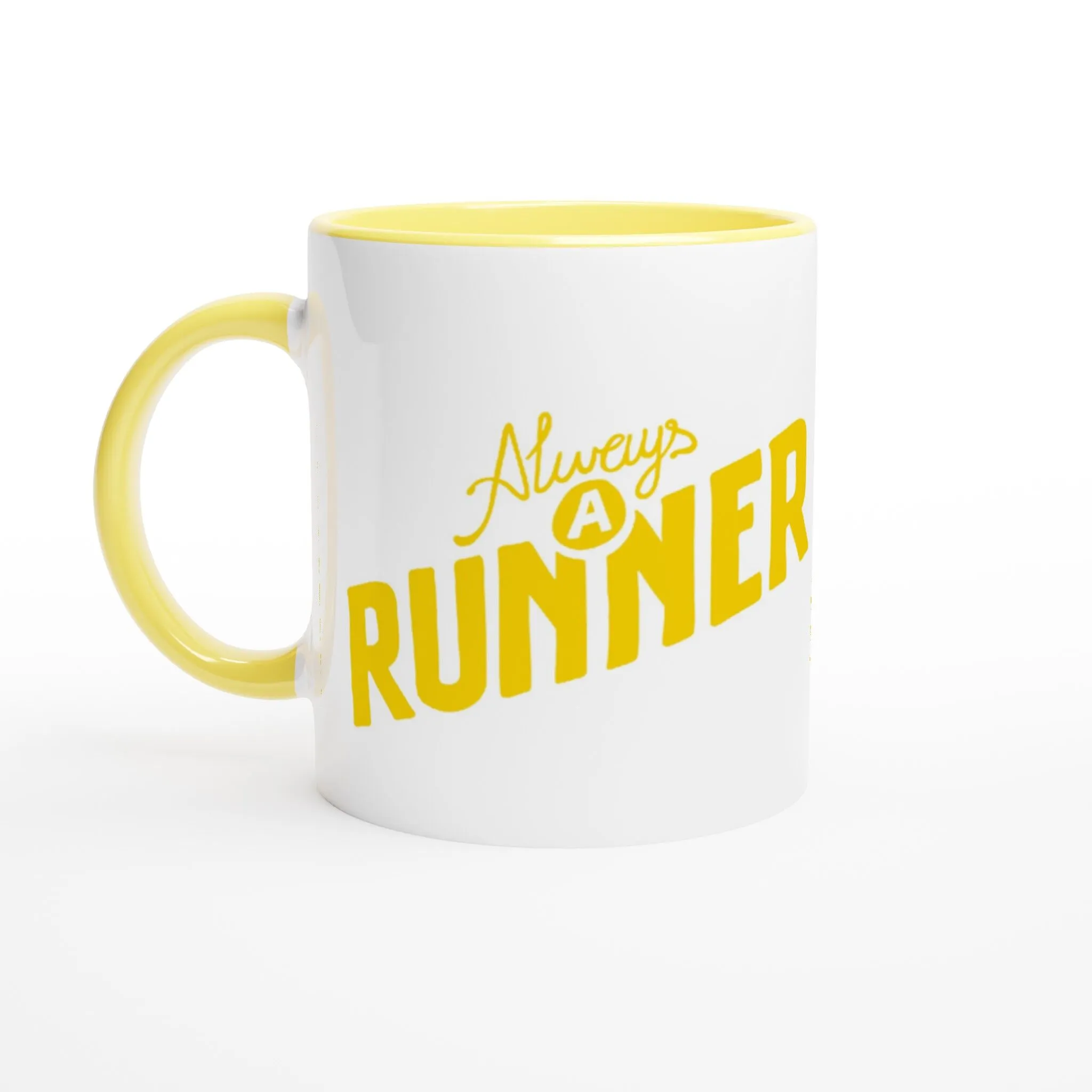 ‘Once a runner, always a runner‘: artwork by Fergus Mc Hugh. This beautiful ceramic mug is glossy white with a yellow rim, inside, and handle. It is microwave- and dishwasher-safe.